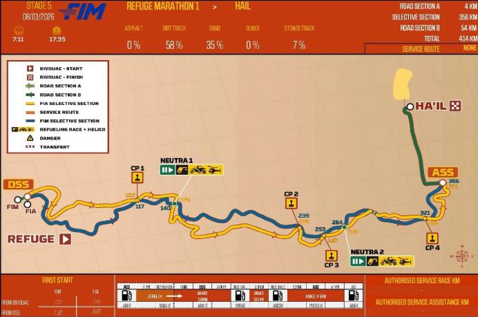 随着第四赛段的结束,2026达喀尔拉力赛的征程已完成近三分之一赛程。在第五赛段中,所有车组将继续在马拉松赛段模式下,于黎明破晓时分在分叉赛道上展开角逐。该赛段以沙地、砾石地和少量碎石路构成,部分岩石地形路段将对全体车手构成严峻考验。尤其是在没有摩托车车辙指引的清晨,汽车组领航员将面临更艰巨的导航挑战。车队需要采取更为谨慎的策略,在速度与稳妥之间找到最佳平衡。