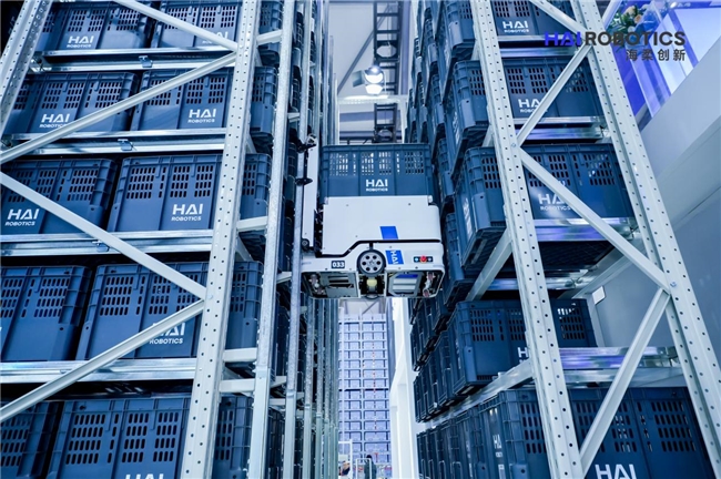 闪攀系统作为海柔最新推出的自动化解决方案,该系统仅靠单一机型闪攀机器人,即可完成垂直攀爬货架、水平地面行走、自主完成货架取箱、运箱出库等动作,并且一台设备可实现自身效率峰值,无需担心因多种机型混合造成的效率耗损。