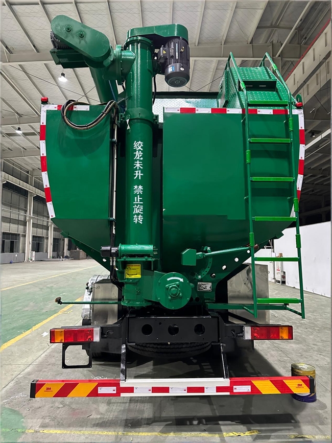 电动上装:罐体有平面/折弯两种外形结构可选,罐体内分3个独立隔仓(可定制)。整车3条绞龙由3个5.5kW电机+380V外接电源驱动构成,顶部绞龙液压控制举升,可左右旋转180°,方便装卸;外接电源成本低、无车辆动力损耗,且支持选装车载发电机实现自发电,适合养殖场有固定电源、追求长期低成本运营的场景。