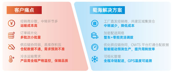 针对中转环节繁杂、链路冗长、温控易断链、协同效率偏低等行业共性痛点,蜀海冷运紧跟市场变化,精准匹配行业新需求,以资源共享、生态共建为方向,打造 “干线集配 + 城际调拨 + 最后一公里” 全流程冷链服务体系,为上游生产厂商、餐饮品牌及零售渠道商提供稳定高效、全程可视可控的冷链运输解决方案。
